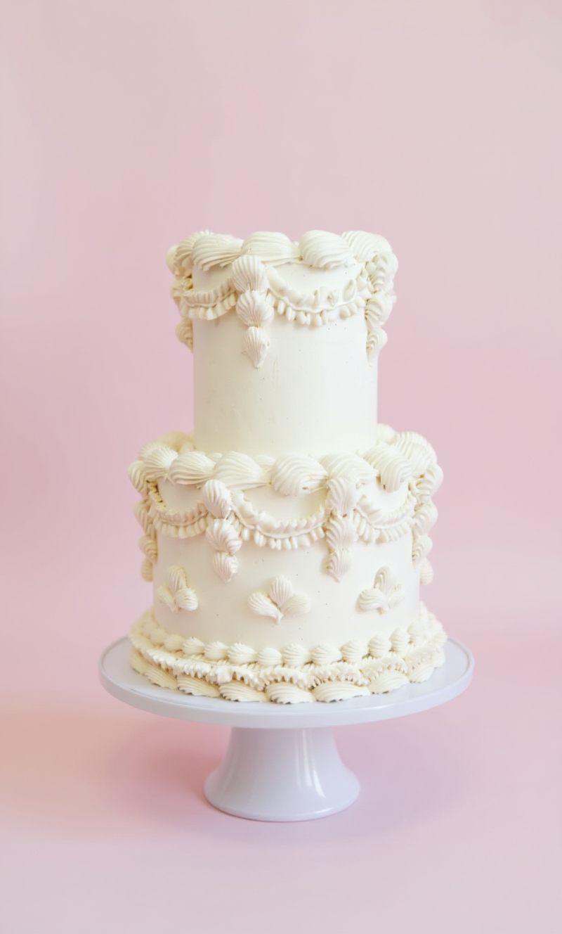 Pictured: Tall height cake with 5 layers of cake and 4 layers of filling. The colour is off-white base and accent piping.