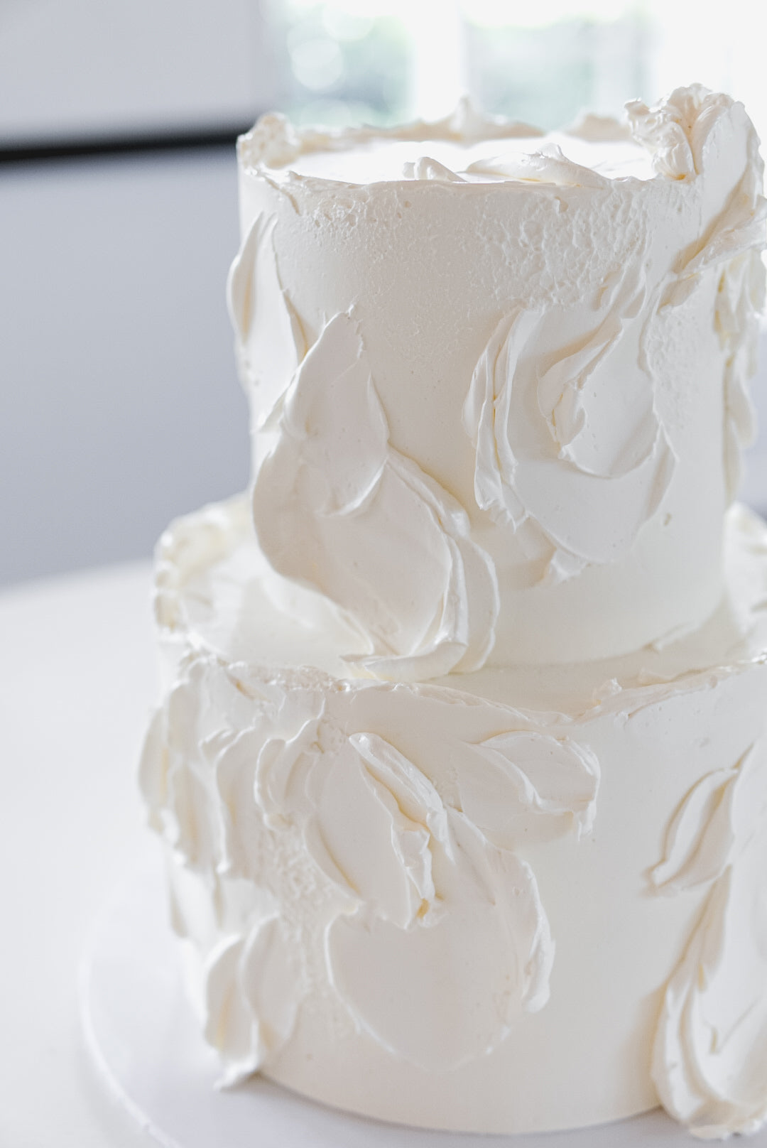 Pictured: Classic-height small two tier size with 4 layers of cake and three layers of filling. Both cake colours are off-white.